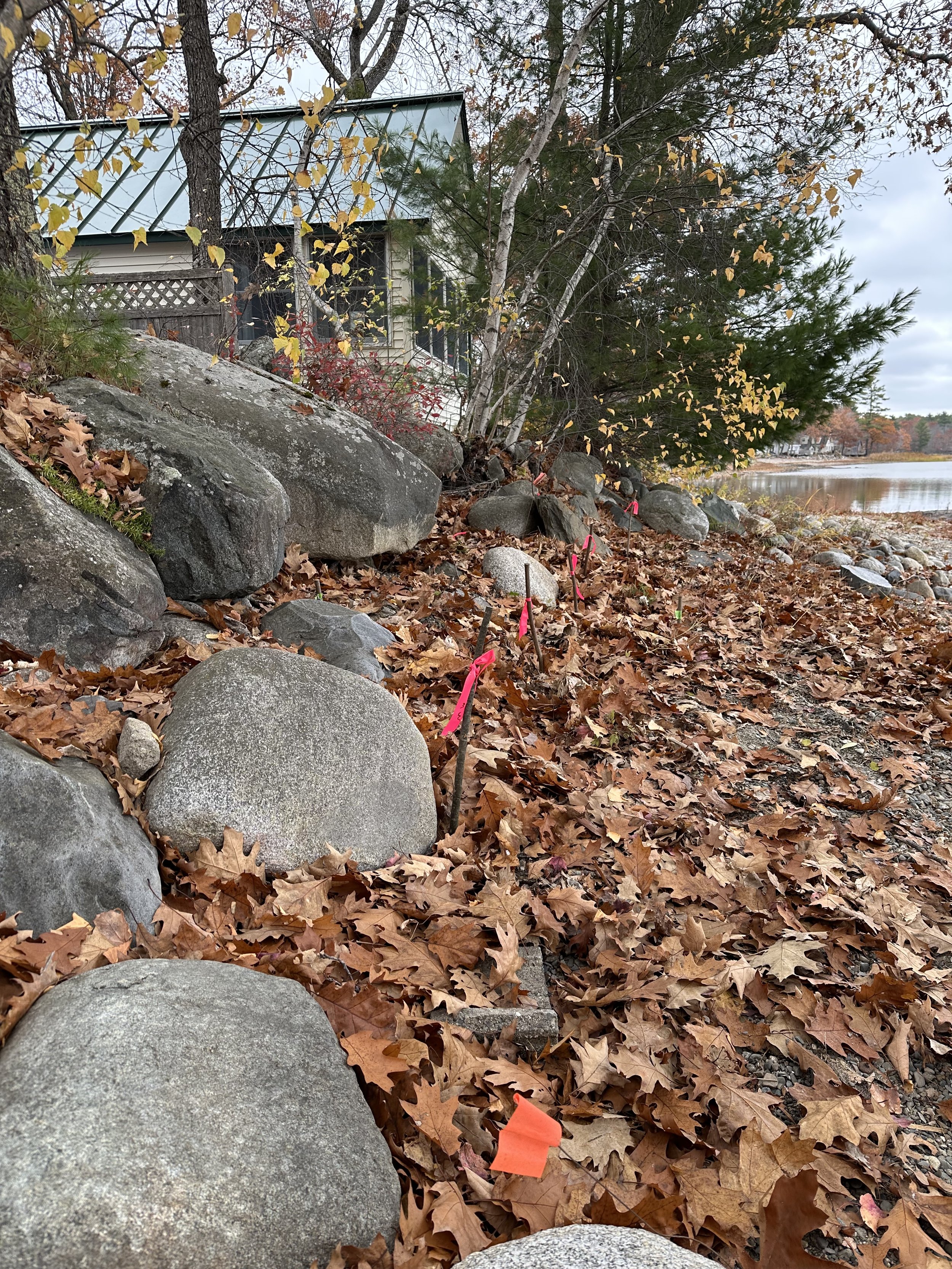 The stakes were then planted on five properties along the Burnham shore, in partnership with landowners who wanted to prevent further erosion and support the broader effort to improve water quality in Unity Pond. Over the next year, we’ll monitor how the plants establish and grow as part of a small experiment to see which species perform best under different site conditions—information that will help guide future shoreline restoration work.