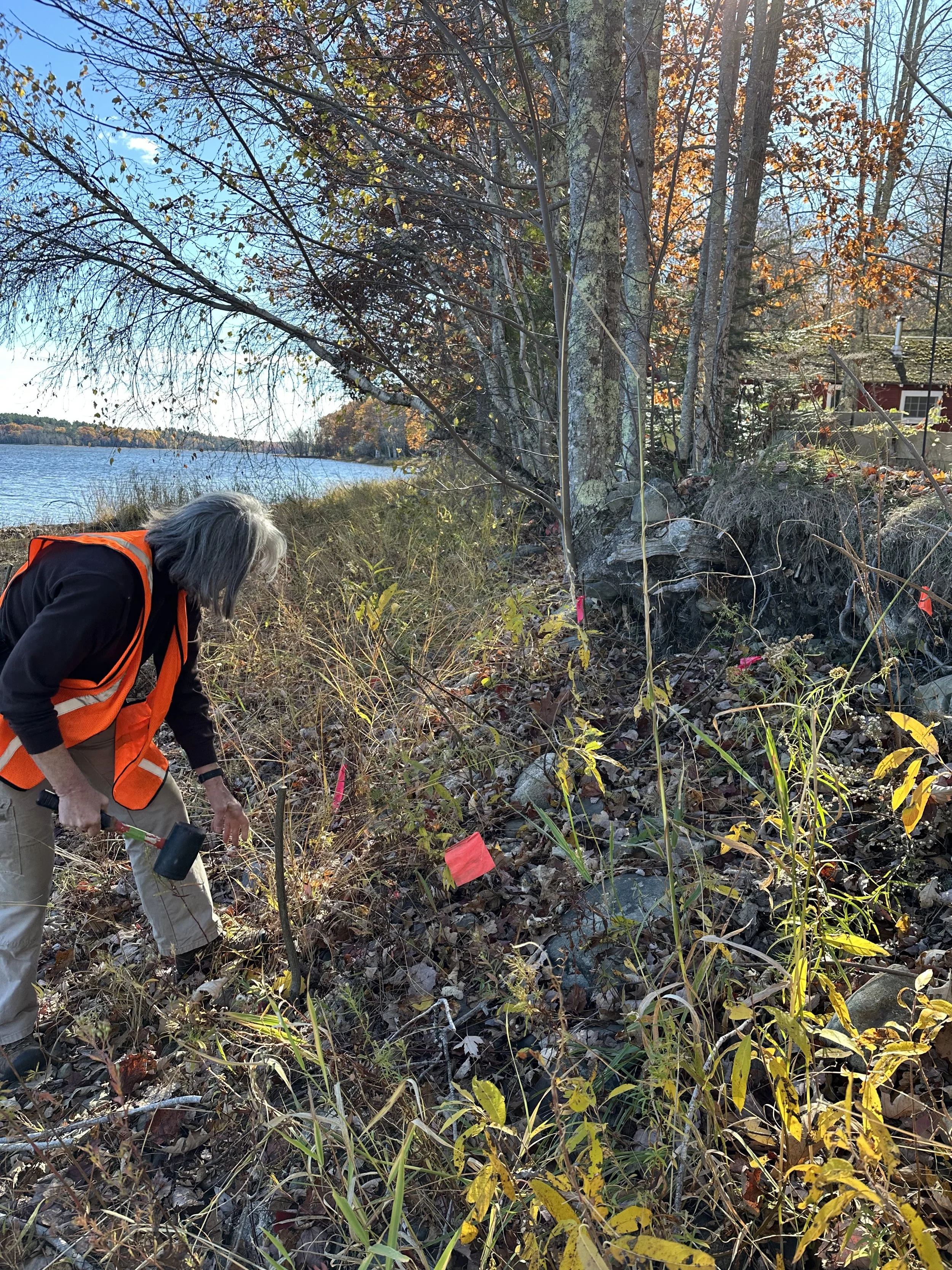 Live staking is a simple, low-cost, and sustainable method for reducing erosion, improving wildlife habitat, and keeping our lakes and streams clean. By planting cuttings of native species directly into eroding banks, we’re not just stabilizing soil — we’re rebuilding living shorelines. These plants grow deep root systems that hold the soil in place, filter runoff before it reaches the water, and create habitat for birds, pollinators, and aquatic life. Over time, the stakes become part of a self-sustaining system that protects both the land and the lake.